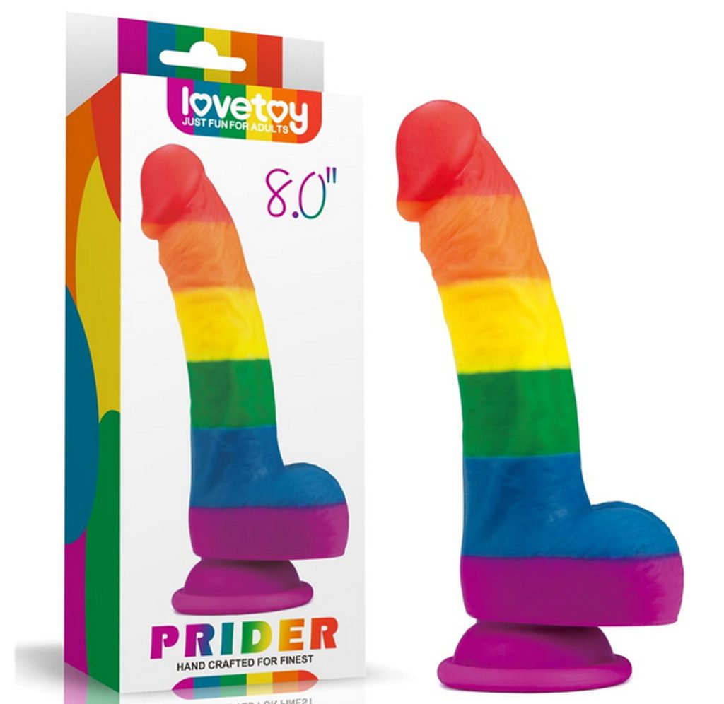Colorful Love Dildo vyrobené z tekutého silikonu, který je měkký a bez ftalátů, s jasnými barvami Pride a přísavnou základnou, která pevně přilne k jakémukoli rovnému hladkému povrchu.