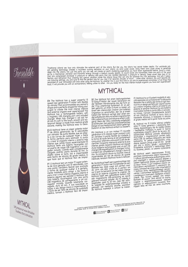 The Invincible a Mythical vás rozechvějí potěšením díky své celosvětově přihlášené technologii, která vytváří bezdotykový pocit sání na vašem klitorisu prostřednictvím zvukových pulzních vln a kombinuje jej se super výkonným motorem F1 nové generace s 10 vibračních vzorů, které se přizpůsobí tvaru každé ženy a vytvoří ten nejintenzivnější orgasmus, jaký jste kdy zažili!