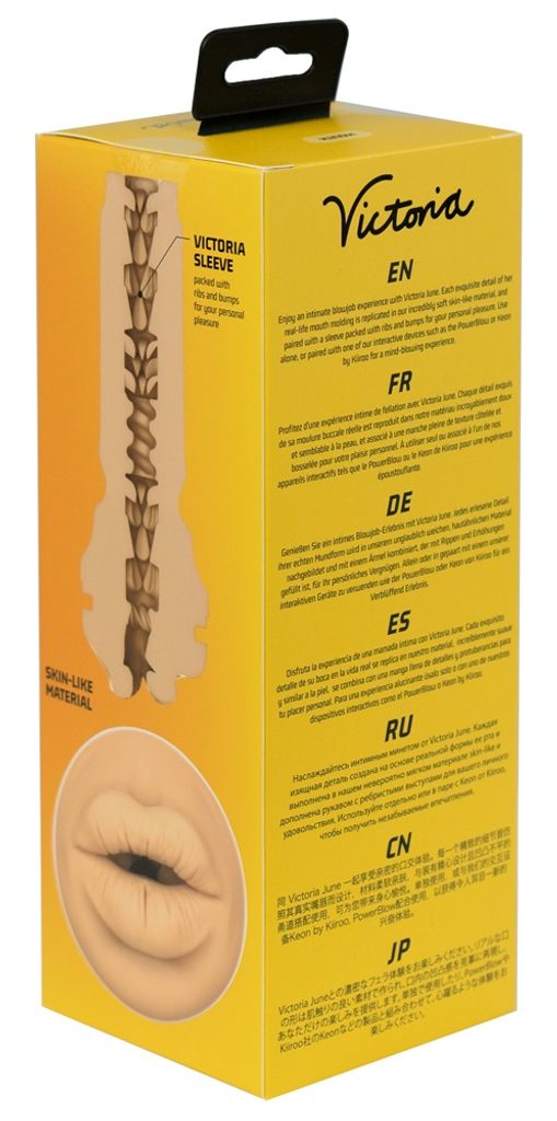 Masturbátor FeelVictoria June Mouth od Kiiroo s originální replikou úst umělkyně Victorie June. Masturbátor lze použít s PowerBlow a Keon adaptérem od Kiiroo pro plně automatické, interaktivní potěšení (není součástí, nutno dokoupit).