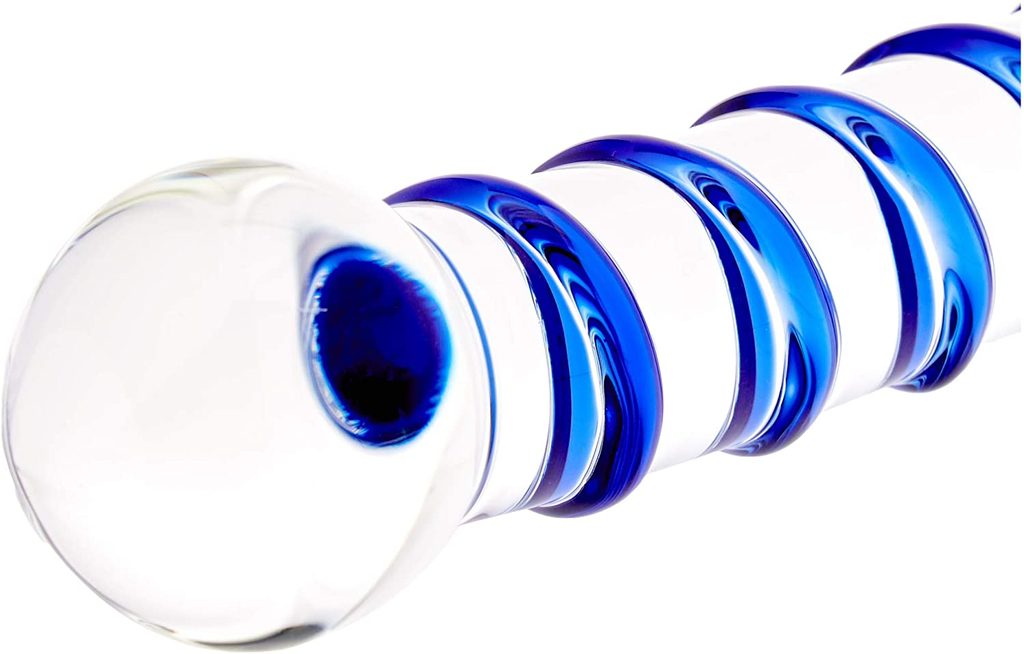 Skleněné dildo s větší kulatou špičkou a modrou vystupující spirálou. Zvýšený spirálový hřeben zvyšuje stimulaci, zatímco baňatá hlava aktivuje bod G.