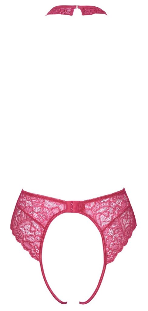 Body s otevřeným rozkrokem od Cottelli LINGERIE je celé z jemné růžové krajky. Hebký a elastický materiál zaručuje příjemný pocit při nošení. Na přední straně svádí hluboký klíčový výstřih pod krajkovým halterneckem. Záda jsou odhalená, halterneck má zapínání za krkem a od rozkroku až po zapínání na háček nad zadečkem je model zcela otevřený.