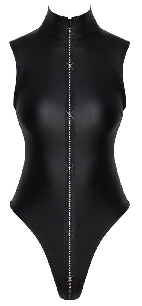 Zdůrazňující body od Cottelli PARTY je vyrobené z módního černého matného materiálu. Obsahuje dlouhý zip se třpytivými kamínky, který vede od stojáčku přes rozkrok. Body je tanga střihu s velmi vysokými nohami, které dokonale zvýrazní nohy a hýždě. Elastický matný materiál těsně, ale pohodlně přiléhá k tělu.